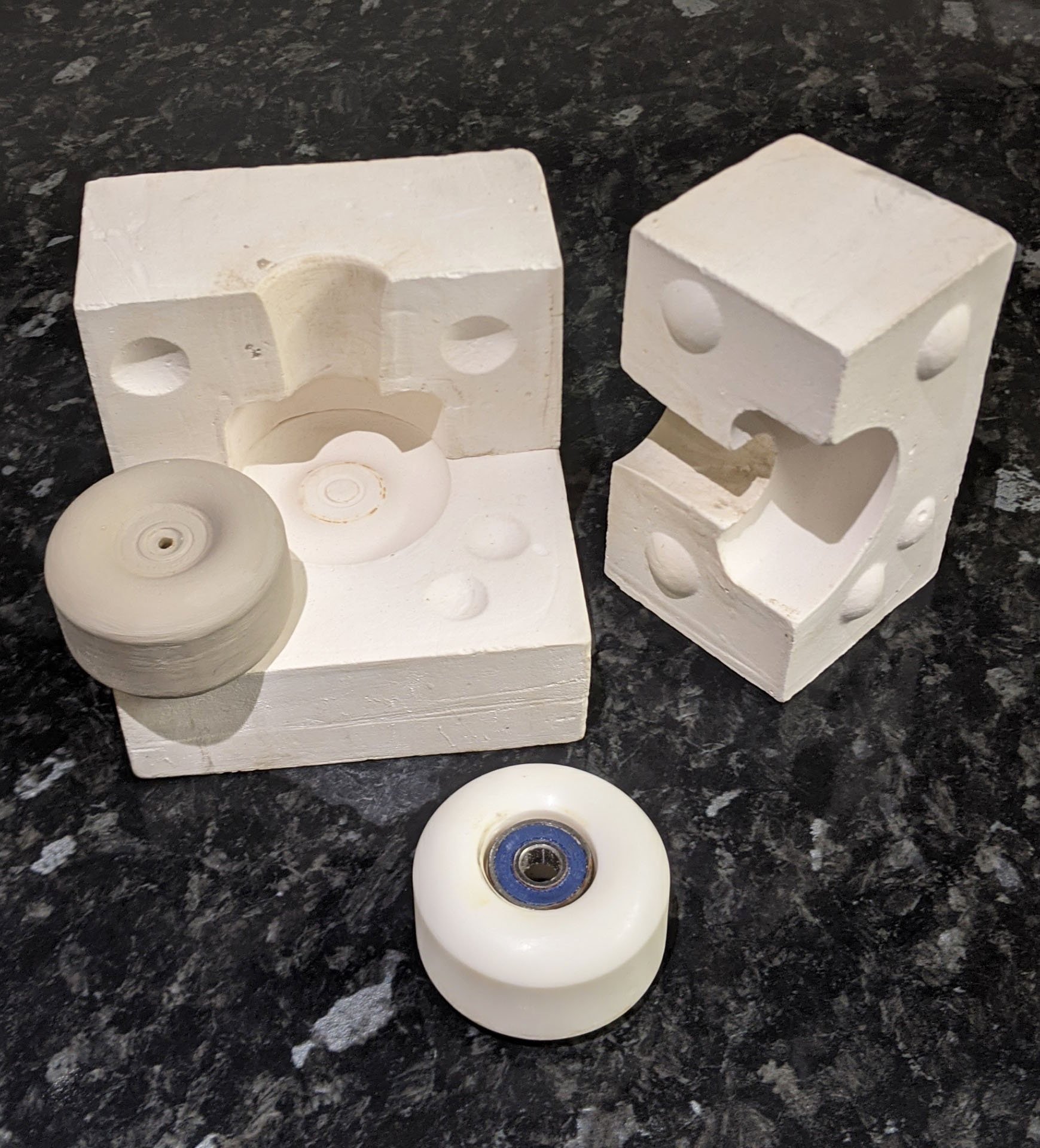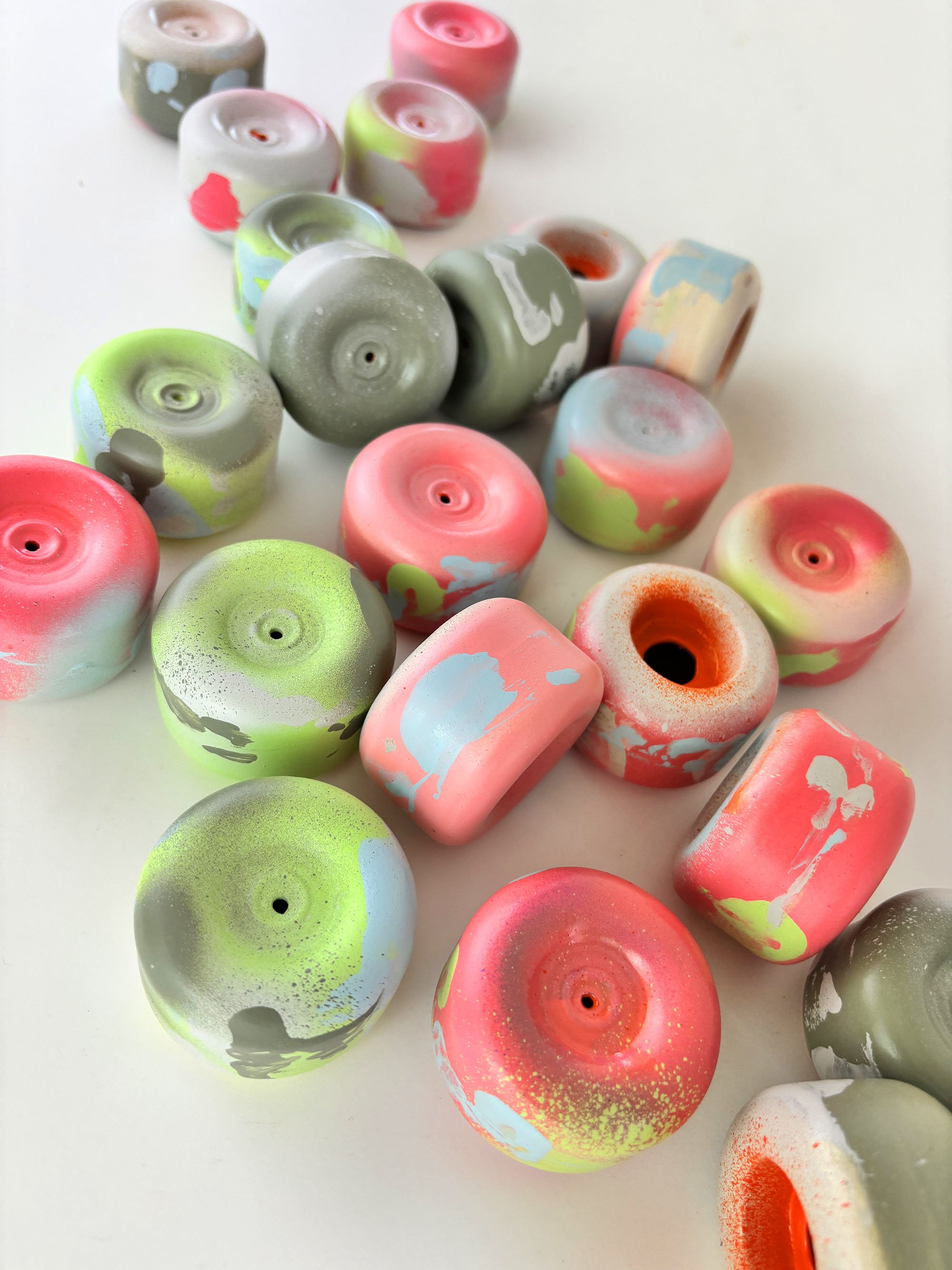Hand crafted ceramic skate wheel incense stick holders using a traditional production process of slip-casting. They have been hand spray painted and gloss varnished.